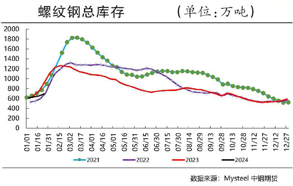 由于今年春節時間偏晚,從歷史統計情況來看,通常在春節假期和隨后的2周~3周庫存上升速度最快。從近兩年的庫存特征來看,螺紋鋼的庫存峰值在1300萬噸上下,尤其是2023年,在春節后達到峰值,此后去庫存,全年保持偏低庫存水平,走勢趨同于2019年。從今年的冬儲態度和鋼企停產檢修情況來看,筆者認為今年的庫存高點在1260萬噸~1320萬噸,整體庫存壓力不大,隨著春節后開始逐漸去庫存,庫存不會給鋼價帶來壓力。