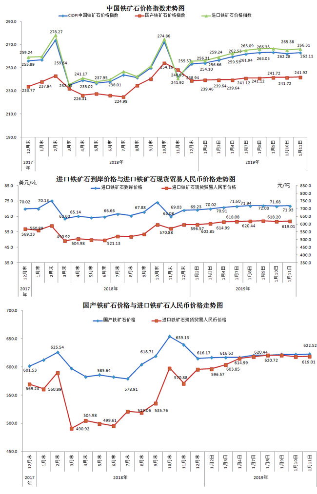 1月11日,現貨貿易進口鐵礦石62%品位干基粉礦人民幣含稅價格為619.01元/噸,環比每噸上升0.81元,升幅為0.13%,當月平均價格為613.98元/噸。