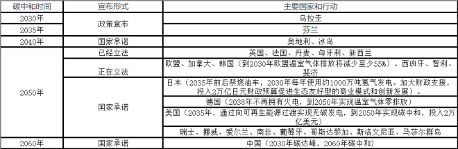 隨著全球平均溫度的升高以及極端氣候事件頻發,國際社會向主要經濟體施加的碳減排壓力越來越大。2019年7月聯合國秘書長倡議“到2030年將溫室氣體排放量較2010年水平削減45%,到2050年基本實現碳中和”。同年9月底聯合國氣候行動峰會上,65個國家承諾在2050年前實現溫室氣體凈零排放。