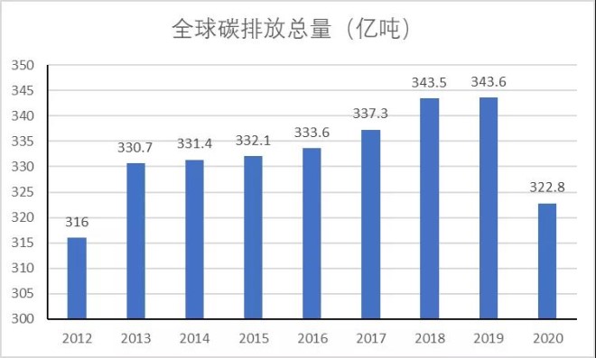 據英國石油公司(BP)發布的《世界能源統計年鑒》顯示,2012年以來全球碳排放量持續增長,2019年全球碳排放量達到了343.6億噸,創歷史新高。2020年全球受新冠肺炎影響,碳排放量下降至322.8億噸,同比下降6.3%(詳見圖1)。