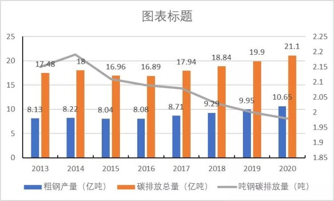 我國鋼鐵行業作為能源消耗密集型行業,是制造業31個門類中碳排放量最大的行業之一,占全國碳排放總量15%左右。近十年來,我國鋼鐵行業一直向低碳綠色改造方向努力,2013年到2020年,我國粗鋼產量從8.13億噸增長到10.65億噸,增幅達到了31%,但是同期鋼鐵行業碳排放總量從17.48億噸增長到21.1億噸,增幅僅為20.71%,噸鋼排放量從2.15噸下降到1.98噸(詳見圖2)。