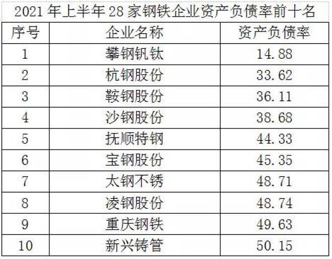 (二)償債能力普遍增強。從資產負債率看,2021年上半年28家鋼鐵企業平均資產負債率57%,與去年同期持平。據公開資料顯示,2021年上半年我國重點大中型鋼鐵企業的資產負債率為62.09%,28家鋼鐵企業的平均負債情況好于全國重點大中型鋼鐵企業平均水平,其中有20家鋼鐵企業資產負債率低于62.09%,有5家鋼鐵企業的資產負債率超過70%。