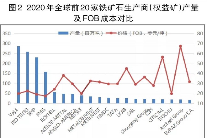 根據全球權威行業數據,2020年全球鐵礦石產量前20家的企業共生產了14.54億噸鐵礦石,占全球總量的67%以上,而這20家企業中除安賽樂米塔爾、LKAB、首鋼、鞍鋼4家公司外,其他的企業FOB成本均低于或接近全球32.6美元/噸的平均值。