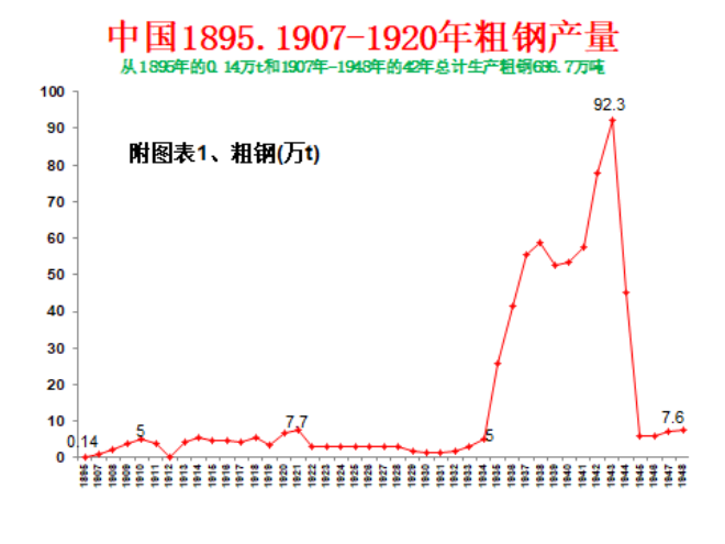 從可查詢到的當時歷史數(shù)據(jù)中可知,最初僅在1895年有過1400噸的鋼產(chǎn)量統(tǒng)計,1896年至1906年的10年里都沒有粗鋼產(chǎn)量的統(tǒng)計數(shù)據(jù)。而后從1907年開始才連續(xù)有了全國少量粗鋼和生鐵統(tǒng)計較系統(tǒng)的數(shù)據(jù)(詳見下圖表1),從1896年和1907年直至1948年的43年中,累計生產(chǎn)粗鋼僅有686.74萬噸。