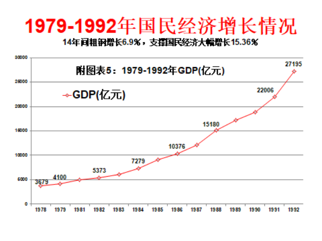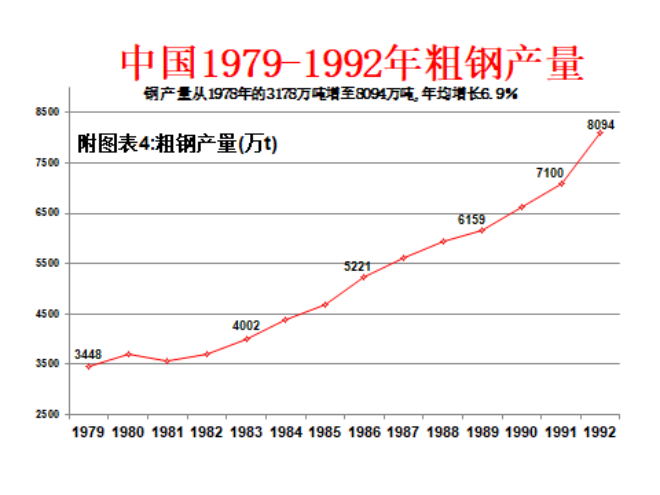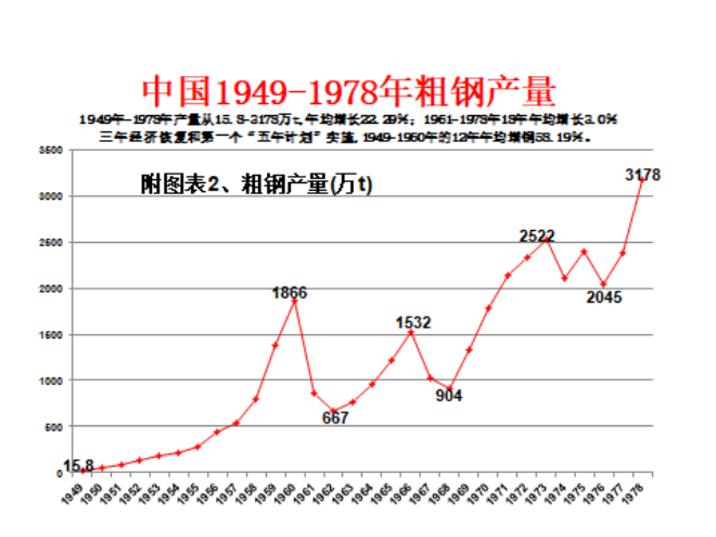遺憾的是,三年“大躍進”的錯誤和以后10年“文化大革命”內(nèi)亂的折騰,讓1958-1978年的20年間,粗鋼產(chǎn)量年均增幅下降至7.14%,遠低于前三年恢復時期和“一五計劃”期間的增長幅度。還有難忘的1974年到1976年的三年打不下“兩千六”,都使國民經(jīng)濟和社會的發(fā)展速度受到一定影響(詳見附圖表3)。