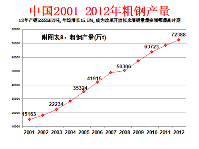 三是2001年至2012年的國民經(jīng)濟高速發(fā)展推進鋼鐵工業(yè)更加快速發(fā)展時期。
