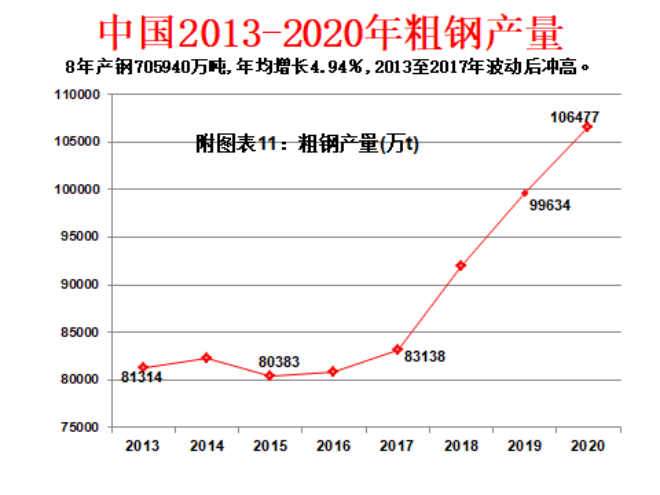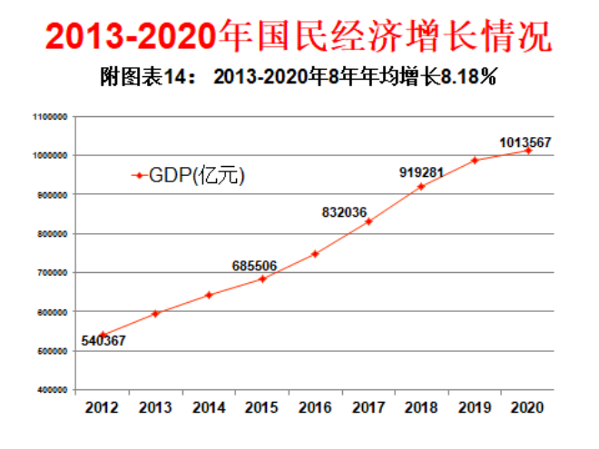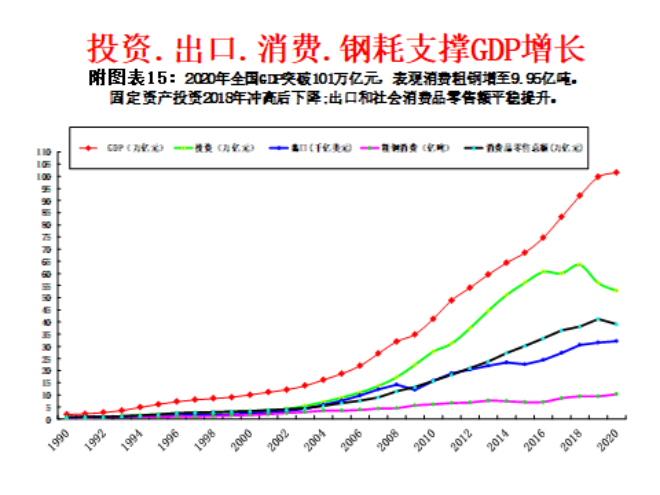 2013-2020年,中國粗鋼產(chǎn)量在2012年7.24億噸的基礎上再繼續(xù)攀上8億噸到10億噸的3個高臺階,但增鋼速度有所放緩(詳見附圖表11),產(chǎn)業(yè)結(jié)構(gòu)優(yōu)化、企業(yè)兼并重組和產(chǎn)品品種質(zhì)量以及節(jié)能低碳減排、環(huán)保治理水平明顯提高。鋼材出口因中低端品種減少而出口數(shù)量下降(詳見附圖表12),出口價值上升。中國8年內(nèi)約60多億噸鋼的消費,5.26億噸鋼材的凈出口,極大地支撐著超大規(guī)模制造業(yè)的規(guī)模、大量機電產(chǎn)品的出口(詳見附圖表13)、國內(nèi)外巨大的消費市場需求。以及全球嚴峻的新冠肺炎大流行疫情和美中貿(mào)易戰(zhàn)、科技戰(zhàn)強大逆流沖擊下,仍取得國民經(jīng)濟(GDP)社會平穩(wěn)發(fā)展的好成績(詳見附圖表14)。