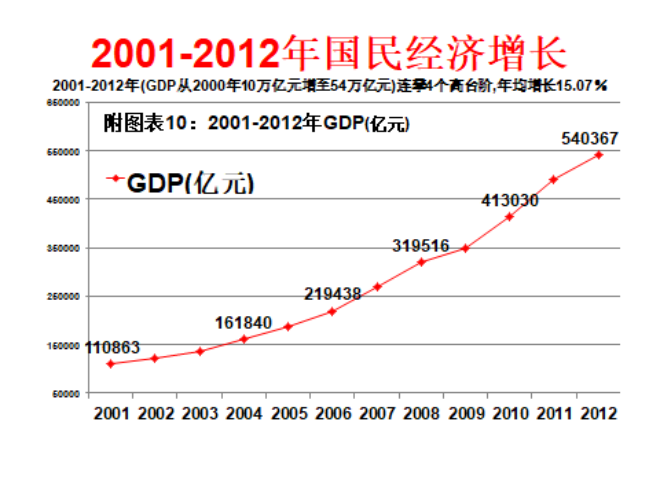 鋼鐵工業(yè)的高速度增長,強勁支撐起國民經(jīng)濟社會的快速發(fā)展,2001-2012年,國內(nèi)生產(chǎn)總值由2000年的10萬億元增長至2012年的54萬億元,12年年均增長15.07%,成為國內(nèi)生產(chǎn)總值最高速度增長時期,連攀從20萬億到50萬億的4個高臺階。其中,從10萬億元到20萬億元花了6年時間,但從20萬億元到50萬億元也只花了6年時間。(詳見附圖表10)。