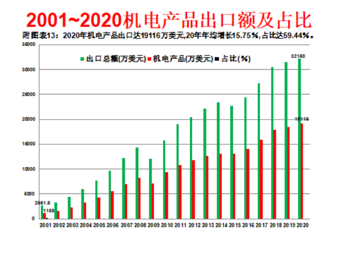據(jù)海關總署數(shù)據(jù)顯示,2020年全國對外出口貿(mào)易總額達3萬億美元,其中機電產(chǎn)品出口貿(mào)易達1.91萬億美元,占比總出口額的59.44%。按傳統(tǒng)出口機電產(chǎn)品總值每億元人民幣相當于間接出口鋼材系數(shù)測算,2020年出口機電產(chǎn)品突破10.66萬億元人民幣,相當于間接出口鋼材近1億噸,較大地提升了鋼材的附加值和國內(nèi)勞動者的就業(yè)率,增強了我國制造業(yè)的市場競爭力。