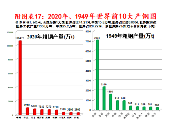滄桑巨變七十余載,民族復興鑄就輝煌。從一窮二白到世界第二大經(jīng)濟體,綜合國力和國際影響力實現(xiàn)歷史性跨越,粗鋼產(chǎn)量從1949年的15.8萬噸到10.65億噸,國內(nèi)生產(chǎn)總值從1952年的679億元到101萬億元、進出口貿(mào)易從1950年的11.3億美元到3.21萬億美元;外匯儲備余額超過3萬億美元;社會消費品零售總額從億元到萬億元;鐵路(高鐵)、公路運營里程、發(fā)電裝機容量、年固定資產(chǎn)投資、基礎建設和制造業(yè)增加值規(guī)模等均世界第一;粗鋼消費從萬噸到9.95億噸(人均粗鋼消費超700公斤),堅挺地支撐著這個有著14億人口、國內(nèi)生產(chǎn)總值為世界第二經(jīng)濟體的中國特色社會主義強國(詳見附表15)。