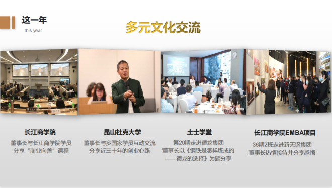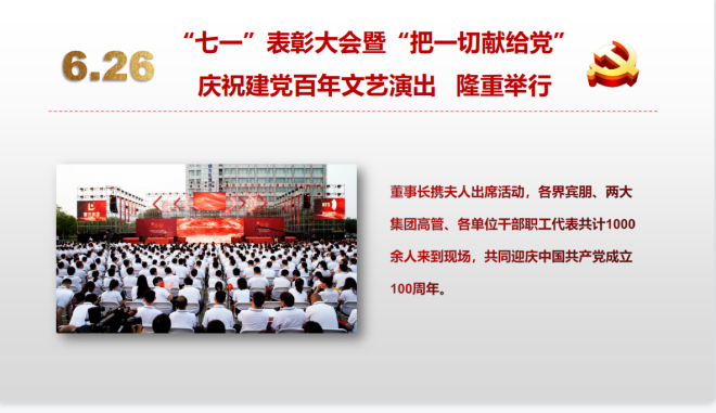 一是關注企業黨建,建設黨建標桿。德龍、新天鋼集團隆重開展系列慶祝活動200余次,還在天津大劇院音樂廳舉辦“聽黨話、愛中華”大型交響合唱音樂會、親自到紅色教育基地學習等;此外還制訂了大量強化企業黨建的規章制度。