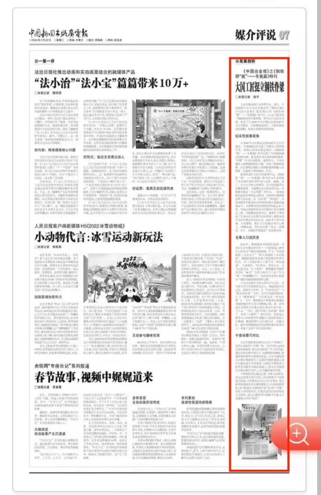 中國冶金報社組織的這些報道也得到了新聞媒體界的關(guān)注與肯定?!吨袊侣劤霭鎻V電報》評述認為,《中國冶金報》的《鋼鐵驕“奧”——冬奧篇》特刊從行業(yè)紀實角度,以行業(yè)當事人的視角,通過今昔場景對比,采寫形成既符合傳播者意圖又能滿足受眾需求的作品,敘述了從2008年北京奧運會到2022年北京冬奧會,中國鋼鐵高站位、大格局推進結(jié)構(gòu)調(diào)整,彰顯出重要的國家使命。