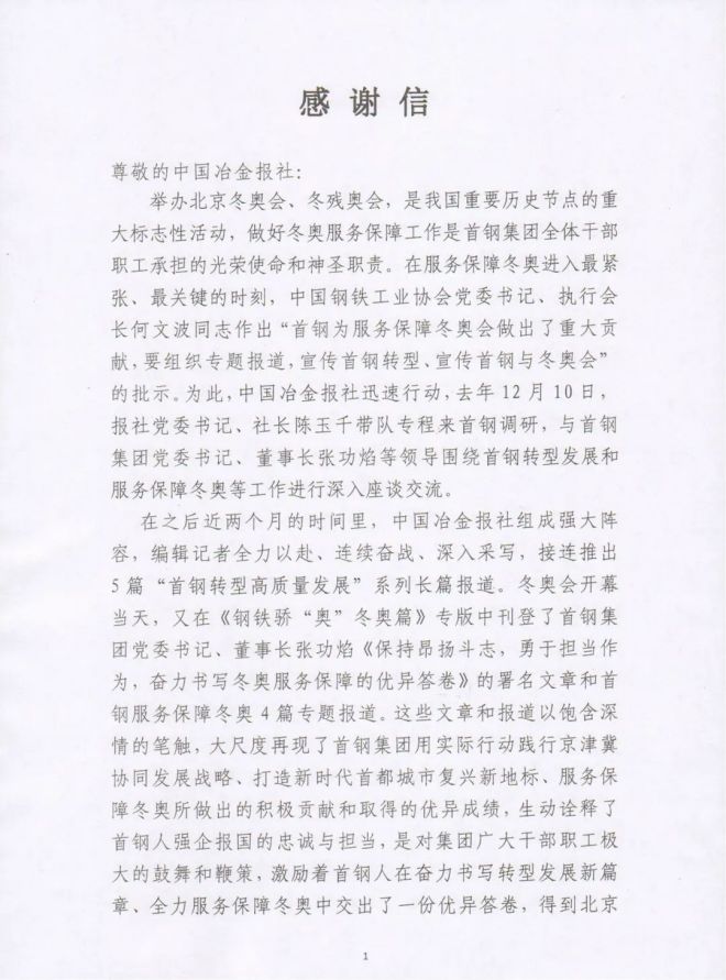 首鋼集團發(fā)來感謝信