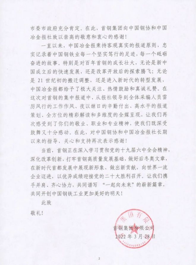 3月28日,首鋼集團向中國冶金報社發(fā)來感謝信,對報社圍繞首鋼轉(zhuǎn)型發(fā)展和服務(wù)保障冬奧等工作進行的一系列專題報道表示感謝。