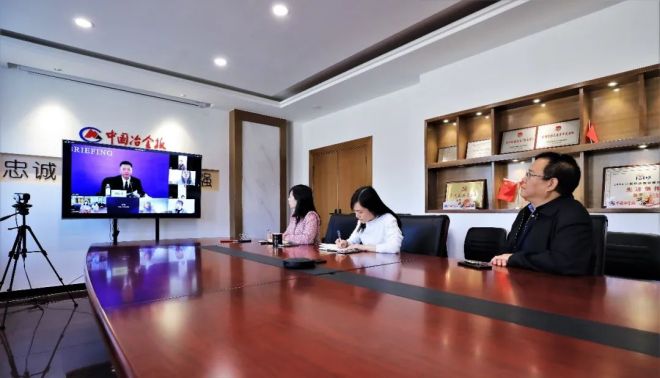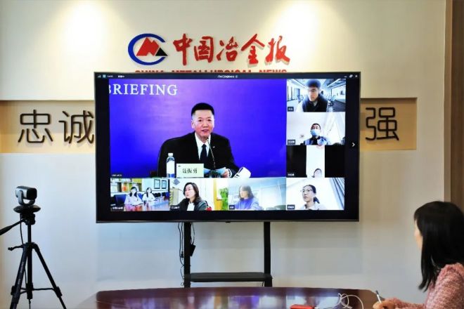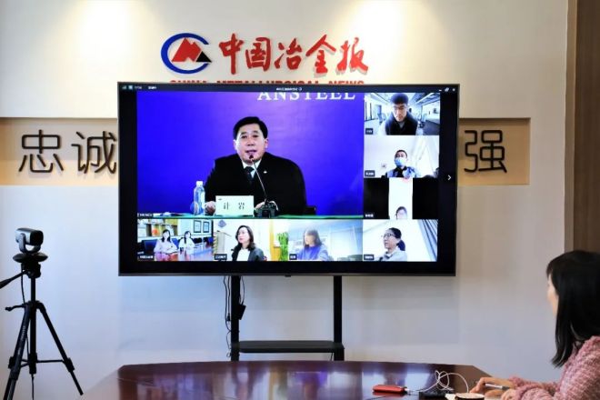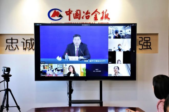 本次會議采用現場+線上直播的方式進行,圖為中國冶金報社黨委書記、社長陳玉千(右一)與《中國冶金報》記者通過視頻參會。