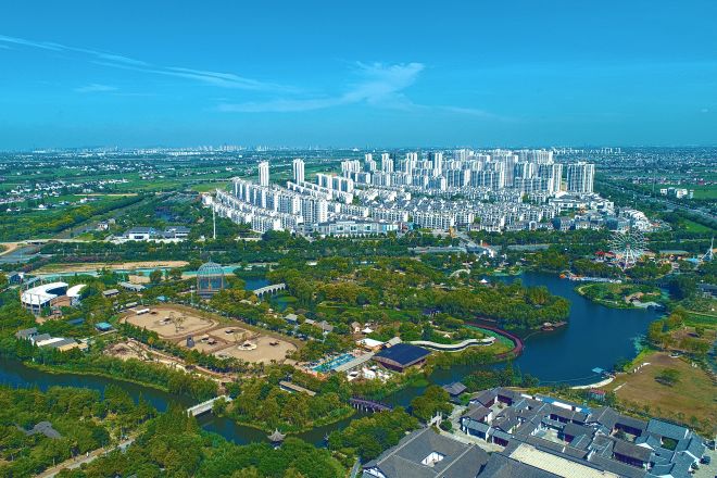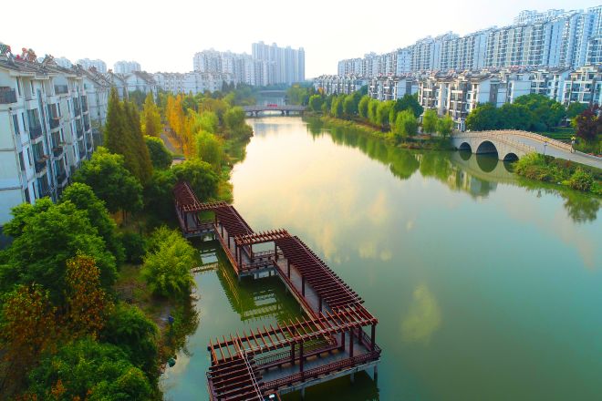 河西岸,江南農耕文化主題公園內翠色掩映,鳥雀成群,遠處小橋流水,亭臺樓閣,與別具江南風情的現代化農民集中居住區構成了一幅充滿詩意的畫卷。