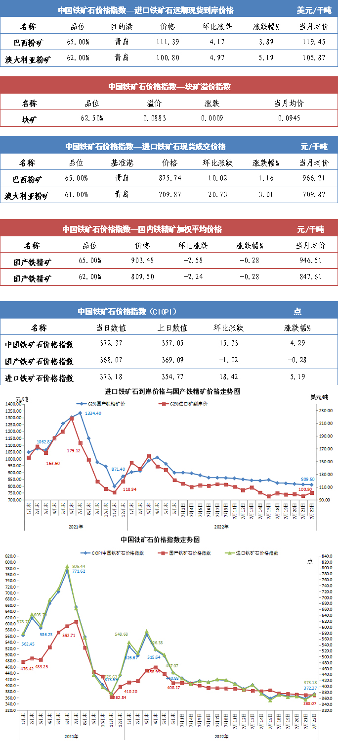 【行業指數】7月22日中國鐵礦石價格指數