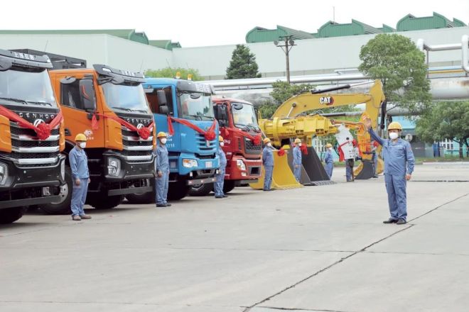 圖為中冶寶鋼踐行綠色發(fā)展理念,更新工程機(jī)械和運(yùn)輸車輛在寶鋼股份寶山基地投入使用。