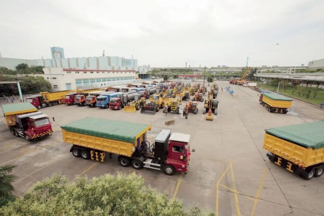 圖為中冶寶鋼191臺(tái)套涉及32種規(guī)格型號(hào)的工程機(jī)械和運(yùn)輸車輛在寶鋼股份寶山基地有序投入使用。