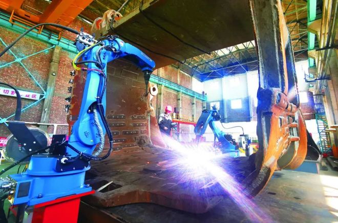 圖為白云鐵礦智能焊接機器人正在對礦用挖掘機鏟斗進行焊接修復。(白立新 攝)
