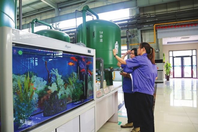 澳森鋼鐵水處理中心職工正在查看化驗(yàn)的水質(zhì)。(本報(bào)實(shí)習(xí)記者 朱亞明 攝)