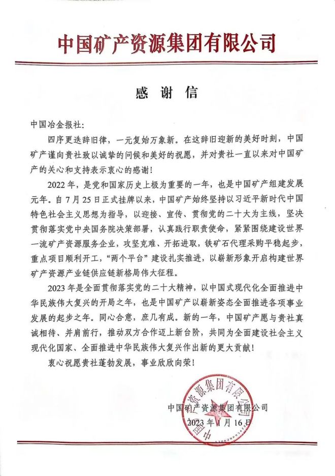 歲起新程,感恩并行。連日來,中國礦產(chǎn)資源集團有限公司、大連商品交易所、上海期貨交易所、廣州期貨交易所向中國冶金報社發(fā)來感謝信,對這一年來報社的大力支持表示感謝,并高度評價了有關(guān)同志的辛勤付出和工作成效,期待未來與報社并肩攜手,在中國式現(xiàn)代化之路上繼續(xù)奮斗,共譜華章!