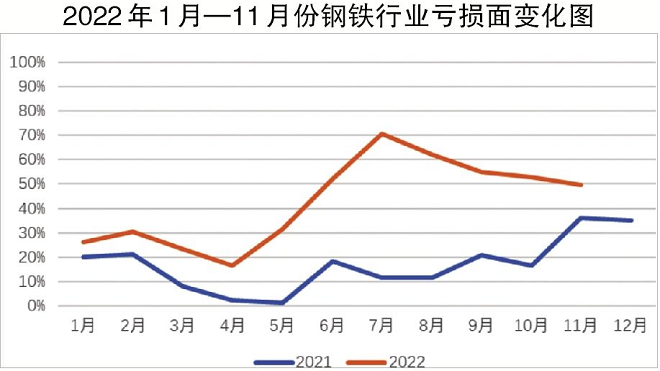 行業利潤大幅下降。受鋼鐵需求下滑、鋼材價格持續走弱和原料價格高企等多重因素影響,2022年鋼鐵行業效益大幅下滑。據中國鋼鐵工業協會統計,2022年1月—11月份重點大中型鋼鐵企業利潤總額大幅下降72.52%。月度虧損面較上年同期有所擴大,虧損面走勢可以分為3個階段:2022年1月—4月份為震蕩期;5月—7月份為利潤快速下降期,行業虧損面在7月份達到最高值70.65%;8月—10月份為弱勢修復期,虧損面逐月收窄,行業下行趨勢得到緩解,利潤水平逐步恢復,但仍與2021年同期水平有較大差距。