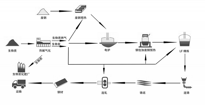 部分生物炭替代全部或部分化石輔助材料,如非生物源輔助材料增碳調碳劑、造渣劑及碳粉等,實現減排;剩余的生物炭進行生物炭長期碳循環,其國際公認溫室氣體清除量抵扣清除掉短流程鋼鐵生產中不可避免剩余溫室氣體排放,實現從搖籃到大門生命周期碳中和。