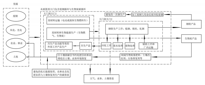 1.邊界系統擴展:將生物質熱解氣化-生物炭生產納入系統邊界內,全廢鋼綠電鋼工藝系統邊界由“從大門到大門,包括廢鋼循環”擴展到“從搖籃到大門,包含廢鋼循環與生物質燃氣生物炭(還田還林)碳循環”系統邊界,鋼鐵工業與農林業生態產業實現一體化。