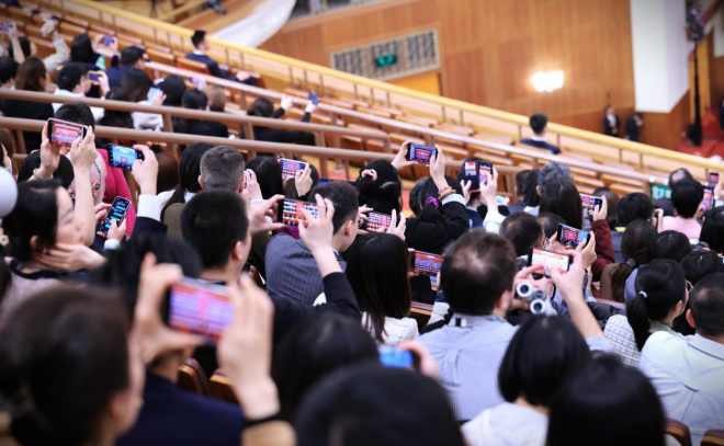 坐在記者席的記者們紛紛用手機拍攝記錄大會盛況
