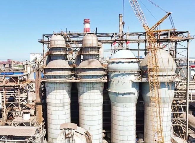 圖為安鋼4747立方米特大型高爐原頂燃式熱風爐,因爐殼開裂而優(yōu)化改造工作正進行中。(劉世聚供圖)