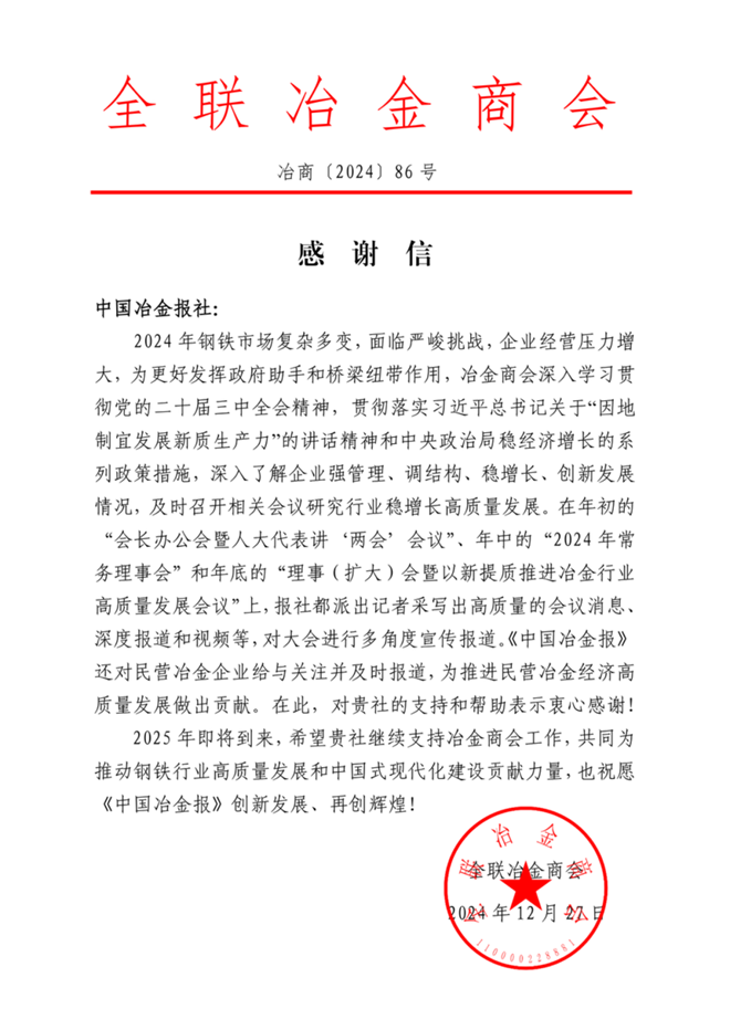 全聯(lián)冶金商會(huì)向中國(guó)冶金報(bào)社發(fā)來(lái)感謝信