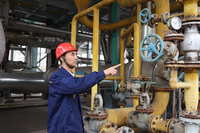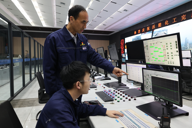圖為沃能化工總經理師少杰在中控室指導員工工作