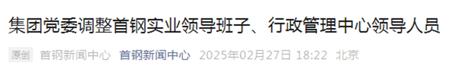 2月27日,首鋼新聞中心微信公眾號發(fā)布了《集團黨委調(diào)整首鋼實業(yè)領導班子、行政管理中心領導人員》一文。
