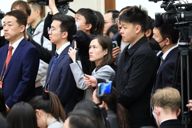 中國冶金報社兩會報道組記者樊三彩(中)在新聞發(fā)布會上拍攝小視頻報道