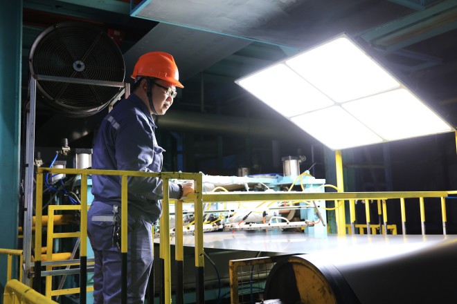 圖為大河金屬新材公司家電一部工作人員正在檢查產品質量