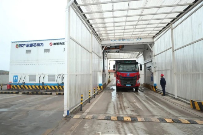 柳鋼物流公司智能換電站,新能源貨車進站換電全程不到5分鐘。閻翔 攝