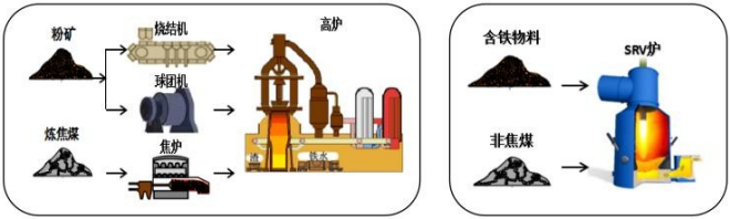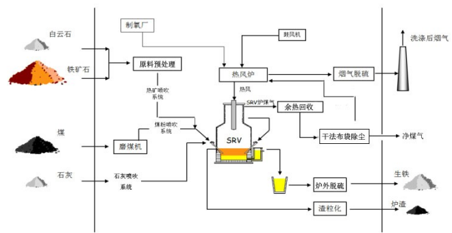 流程優(yōu)勢。HIsmelt熔融還原流程,相比傳統(tǒng)高爐流程省去了焦化、燒結(jié)、球團(tuán)工藝,極大地縮短了工藝流程;相比豎爐工藝,HIsmelt過程不受高品位礦粉和還原氣短缺影響,適用性更強(qiáng),且SRV能源轉(zhuǎn)換功能可以為其他工序提供煤氣保障。