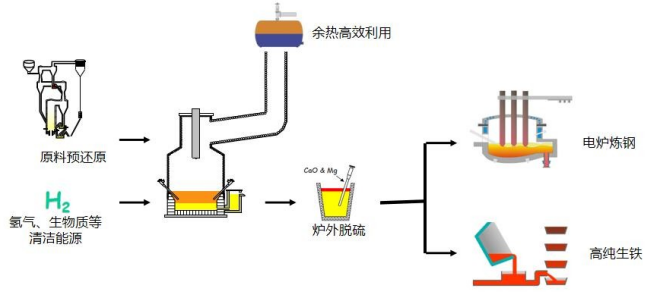 山冶設(shè)計(jì)是國內(nèi)較早具備高爐煉鐵大型化、高端化、現(xiàn)代化的國際技術(shù)公司,對煉鐵技術(shù)更綠色、更智能、更低碳的研究從來沒有停止過腳步。煉鐵工序作為鋼鐵生產(chǎn)過程中資源、能源和成本控制的關(guān)鍵環(huán)節(jié),其CO2排放量約占鋼鐵生產(chǎn)全流程總排放量的70%,是鋼鐵領(lǐng)域節(jié)能減排和轉(zhuǎn)型升級的關(guān)鍵環(huán)節(jié)。現(xiàn)有主流鋼鐵冶煉工藝流程有“高爐+轉(zhuǎn)爐”長流程和電爐短流程,隨著非高爐冶煉技術(shù)的發(fā)展,“HIsmelt煉鐵+電爐或轉(zhuǎn)爐”以及“豎爐+電爐”流程也得到應(yīng)用。高爐工藝經(jīng)過百余年的發(fā)展和實(shí)踐,技術(shù)日臻成熟,由于焦炭特殊的骨架作用難以顯著降低焦炭的消耗,通過設(shè)備升級和操作優(yōu)化可以少量降低冶煉過程能源消耗;HIsmelt工藝過程不使用焦炭,產(chǎn)品純凈度高,生產(chǎn)的鐵水可以直接用于現(xiàn)有轉(zhuǎn)爐或電爐煉鋼過程,目前在山東、河北、山西等地逐漸得到企業(yè)認(rèn)可并開始實(shí)踐應(yīng)用,且隨著氫冶金和預(yù)還原技術(shù)的進(jìn)步減排潛力巨大;豎爐工藝目前在河北、廣東等地逐步應(yīng)用,產(chǎn)品海綿鐵用于電爐冶煉,不使用煤粉和焦炭,但受制于現(xiàn)階段還原氣源的供應(yīng)來自焦?fàn)t煤氣、減排效果還不夠顯著,隨著未來綠電和大規(guī)模制氫技術(shù)的發(fā)展,相信會有更多的應(yīng)用和減排潛力。