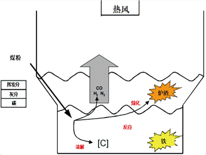 煤粉在載氣N2作用下通過物料噴槍進(jìn)入SRV中,煤粉中的碳在高溫下熔解進(jìn)入鐵水中,煤粉中揮發(fā)分裂解隨上升的氣流進(jìn)入上部空間。礦粉、熔劑等固態(tài)爐料隨著高速載氣噴吹進(jìn)入熔池內(nèi)部,爐料中的金屬氧化物被碳還原生成金屬單質(zhì)和CO(g)。相比于固態(tài)碳,溶解碳還原鐵氧化物的效率高出1~2個數(shù)量級。礦粉的直接還原速度不受反應(yīng)區(qū)工作狀態(tài)和熔渣中FeO含量影響,故SRV單體生產(chǎn)效率比其他熔融還原方法高。