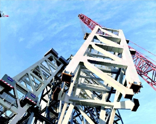 首鋼滑雪大跳臺共有4組支撐柱。其中,1線柱為大跳臺最高支撐柱,自下而上由四節組成,總高為49.1米,總重約為480噸。采用分段拼接組裝方式,安裝時分成四段安裝,工廠預拼現場組裝,在工程現場地面拼接完成后再進行吊裝。首建集團作為施工單位,按照一次性安裝到位的原則和要求,全力做好此次吊裝工作。高空吊裝起重設備采用630噸履帶吊,安裝工作的最大難度是精度要求高,而且是空中對接。為確保安裝工作的順利完成和施工標準及精度要求,吊裝對接過程采用工業全站儀進行跟蹤測量,測量精度達到0.015毫米,保證構件的軸線位置,標高高度零誤差。