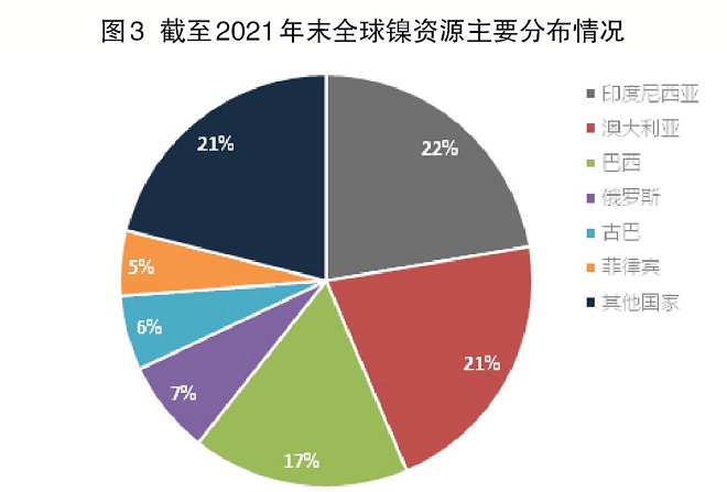 根據美國地質調查局2021年的數據顯示,全球已探明鎳資源(鎳含量高于0.5%)約3億噸,其中紅土鎳礦占比約60%,硫化鎳礦占比約40%。截至2021年末,全球鎳可采儲量約9400萬噸,其中,印度尼西亞可采儲量為2100萬噸,澳大利亞為2000萬噸,巴西為1600萬噸,俄羅斯為690萬噸,古巴為550萬噸,菲律賓為480萬噸。上述六國可采儲量合計占全球總量的近80%。(見圖3)