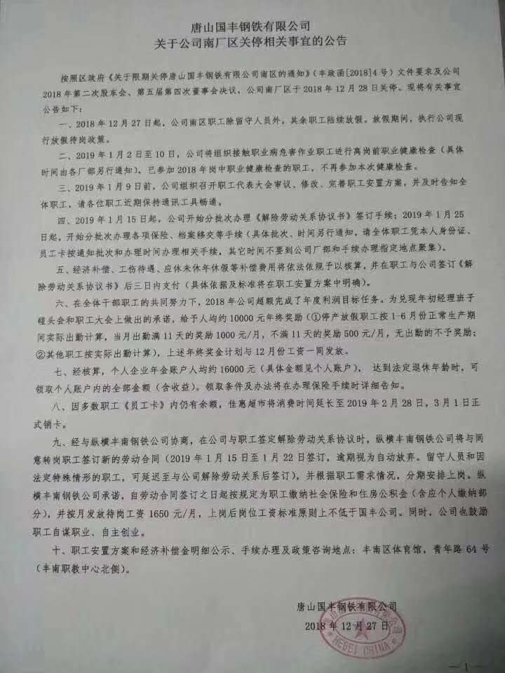 新干線訊:12月27日,唐山國豐鋼鐵有限公司下發公司南廠區關停相關事宜的公告,具體內容如下: