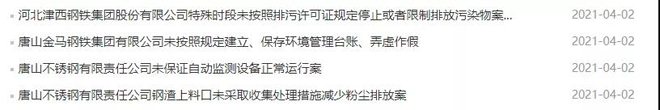 其中唐山中厚板有限公司共計收到罰單11張,處罰金額累計587萬元;唐山金馬鋼鐵集團有限公司、唐山中厚板材有限公司、唐山松汀鋼鐵有限公司等企業因在線監測造假被吊銷排污許可證、責令停業。