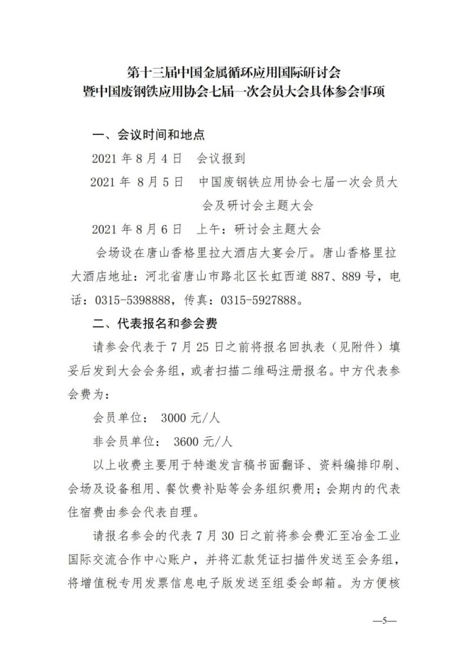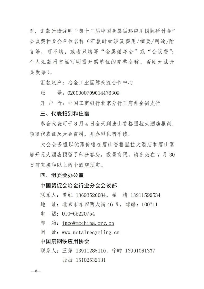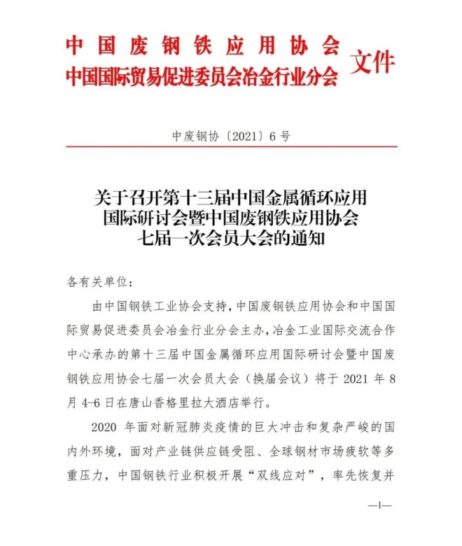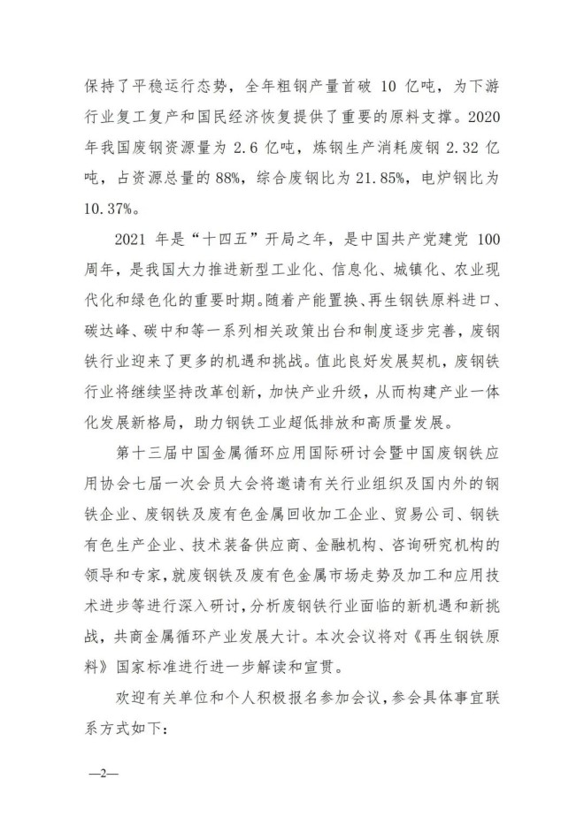 關于召開第十三屆中國金屬循環應用國際研討會暨中國廢鋼鐵應用協會七屆一次會員大會的通知