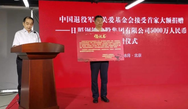 8月6日上午,退役軍人事務部舉行接受捐贈儀式,日照鋼鐵控股集團有限公司向中國退役軍人關愛基金會捐贈5000萬元人民幣。退役軍人事務部黨組書記、部長孫紹騁出席并向捐贈企業頒發捐贈證書。全國政協常委、經濟委員會副主任、武警部隊原上將政治委員、中國退役軍人關愛基金會名譽理事長孫思敬出席。退役軍人事務部黨組成員、副部長馬飛雄主持儀式。京華創新集團總裁薛健、副總裁王立飛見證捐贈儀式。