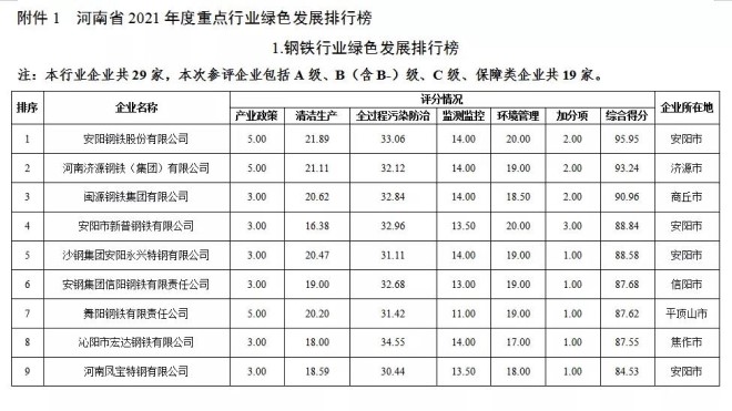 河南省鋼鐵行業(yè)綠色發(fā)展排行榜:安鋼第一名