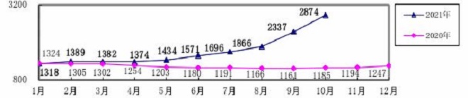 對標企業煉焦煤10月份加權平均折算成干基的采購成本為2874.28元/噸,環比升高537.16元/噸,升幅為22.98%。1-10月累計平均折算成干基的采購成本為1734.58元/噸,同比升高506.60元/噸,升幅為41.25%。
