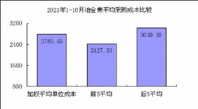 冶金焦10月份加權平均折算成干基的采購成本3967.59元/噸,環比升高359.19元/噸,升幅為9.95%。1-10月累計平均折算成干基的采購成本為2785.45元/噸,同比升高950.75元/噸,升幅為51.82%。