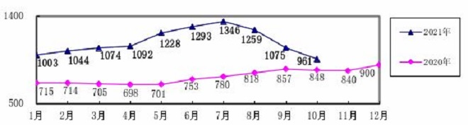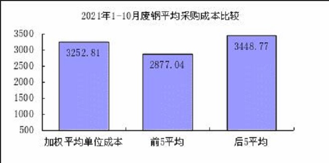 廢鋼10月份加權平均采購成本為3469.85元/噸,環比升高31.79元/噸,升幅為0.92%。1-10月累計平均采購成本為3252.81元/噸,同比升高882.41元/噸,升幅為37.23%。